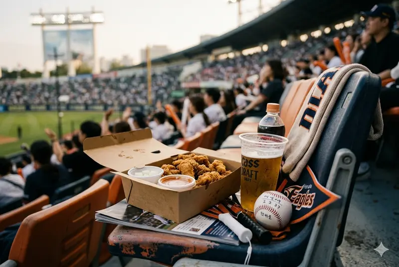 Food arrives not just from concession stands, but through delivery systems. Fans order meals directly to their seats—fried chicken, snacks, even full dishes—turning the stadium into an extension of everyday Korean life.
