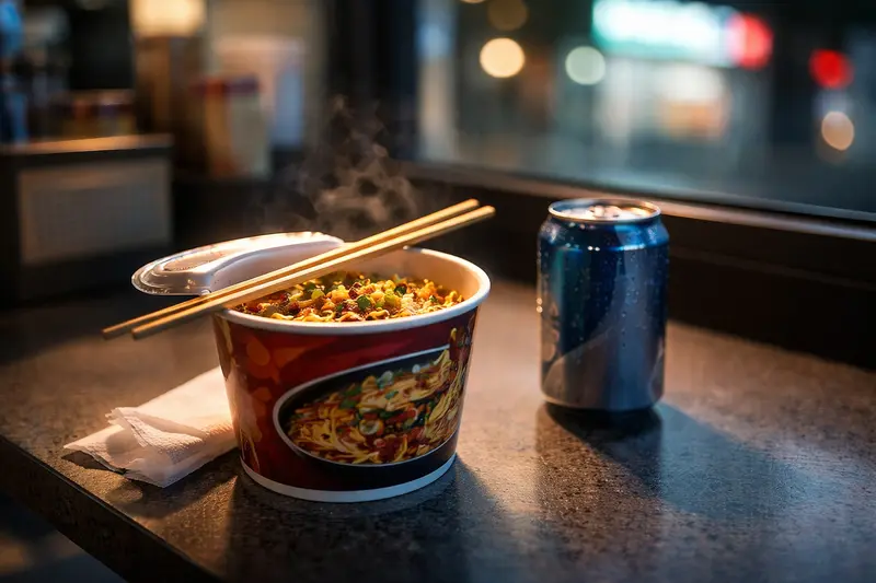 Convenience stores provide a space where solitary eating feels natural rather than awkward.
