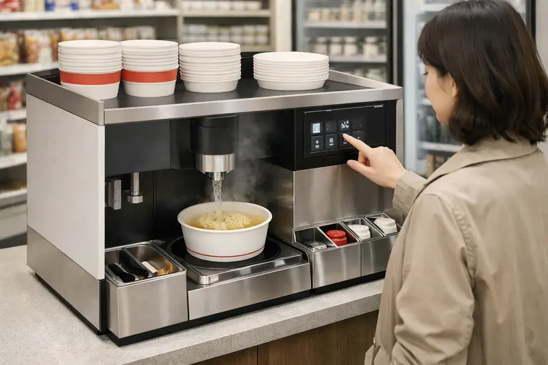 Customers place the noodles and seasoning into a disposable bowl, add water, and insert the bowl into a heating machine. A few minutes later, the ramen is ready to eat.