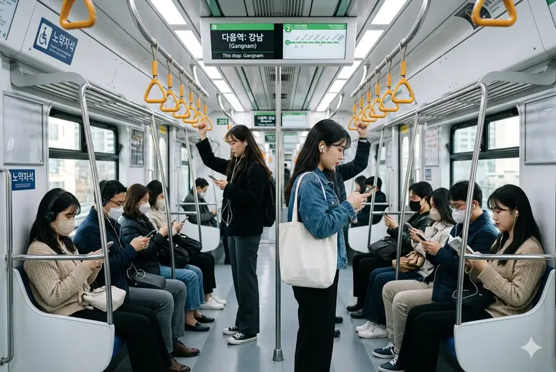 Step into a crowded subway car in Seoul during rush hour and one detail quickly stands out.