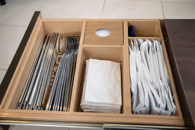 Answer: Most drawers contain metal chopsticks, a long-handled spoon, and napkins. Some may also include toothpicks, wet wipes, or small tools like bottle openers.